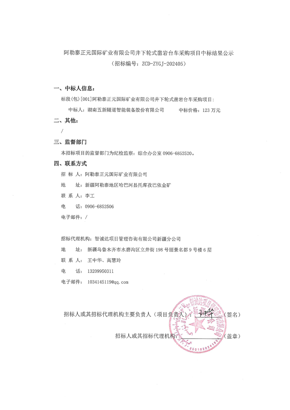 本站音问云开体育,字据天眼查APP信息整理,12月27日公布的《阿勒泰正元海外矿业有限公司井下轮式凿岩台车采购方式中标后果公示》中深入湖南五新地谈智能装备股份有限公司中标。公告本色如下: